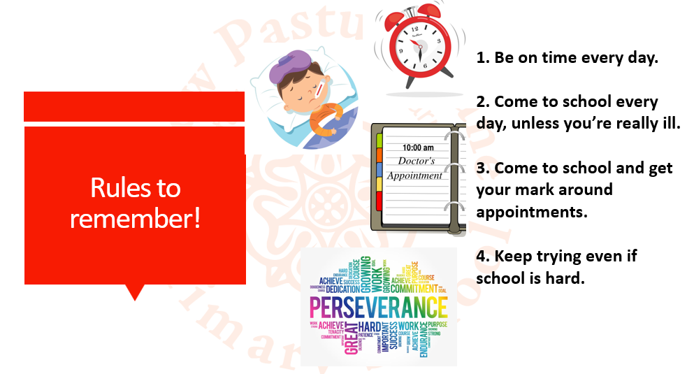 We have four easy 'rules to remember' which is a focus for our weekly attendance assemblies: